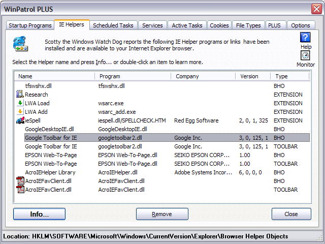 Scotty will watch for new IE Helpers and alert you whenever a new BHO or Toolbar Add-On is installed. WinPatrol provides several buttons to allow you to get more information on currently installed IE Helpers and remove suspicious BHOs and Toolbar Add-Ons.