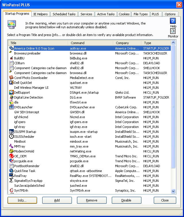 with a number of programs which start automatically. While many of these programs may useful, many of them are not required to run at all time. Some are loaded "just in case" you want to run their main program quicker. Some constantly go out on to the internet checking to see if you have the most current version of their software. Some run at all times on the task bar just in case you want to change or reconfigure some settings. If you purchase a new computer, we recommend using WinPatrol PLUS to learn more about what program are necessary. By preventing the unneeded programs from running you could increase the speed of some applications up to 40%.