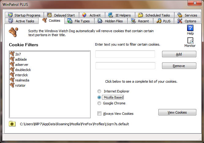 Since Firefox 3 changed from cookie.txt to SQLite database format Scotty hasn't been hungry for Firefox cookies. Support for Firefox 3 has been the single most requested features. Turns out I was able to include support for the SQLite format without increasing the size of WinPatrol.exe. While I was at it I also included support for Google Chrome which also uses SQLite to store their cookies. Note: Firefox cookie can not be viewed or removed while Firefox is running.